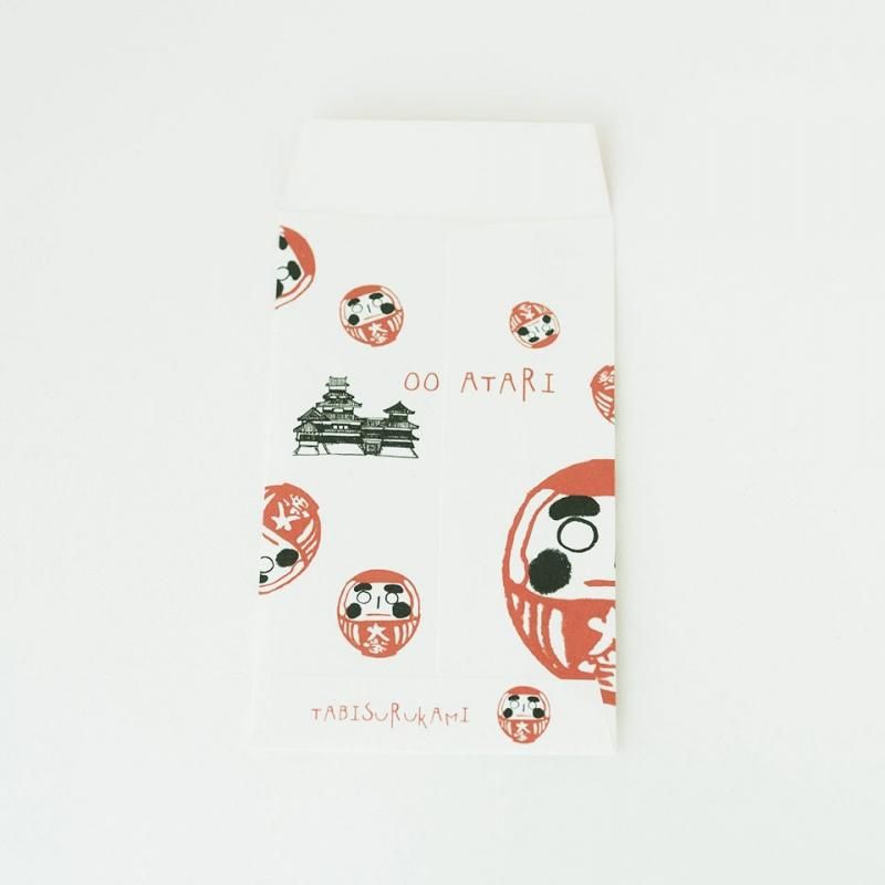 かつて養蚕業が盛んだった松本。松本だるまに書かれた『大當』(おおあたり)の文字は、お蚕さんがよくとれた年の事を「大當」と表現したことから、『当たり年になりますように』と願いがこめられています。裏に、「oo atari」の文字と、ちょこんと松本城が入っています。あなたにも福がありますように。2枚入り。